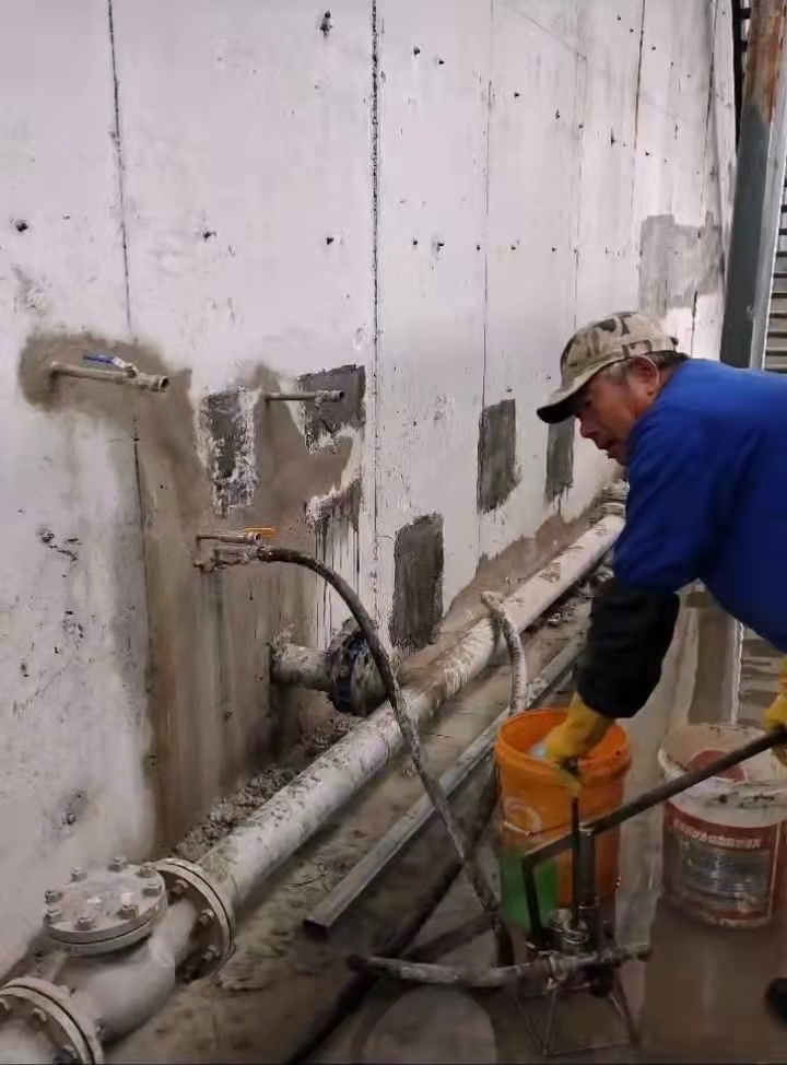 選其中一孔注漿(選擇在較低處及漏水量較大的注漿嘴),待多孔見漿后,立即關(guān)閉各孔,仍繼續(xù)注漿,注漿壓力應(yīng)大于滲漏水壓力,使?jié){液沿著滲水通道迸向推進(jìn), 直到不再進(jìn)漿時,先立即關(guān)閉注漿嘴再停止壓漿。注漿結(jié)束后,將注漿孔及檢查孔封堵密實。待漿液凝固后,剔除注漿嘴,觀察注漿堵漏效果,必要時可重復(fù)注漿。污水池止水帶帶水補(bǔ)漏 水池堵漏施工方法 鹽城市之睿祥防水堵漏工程有限公司