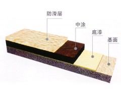 防滑型地坪 適用范圍  工廠、停車場、坡道、人行道等需防滑的地坪。性能特點  1、 止滑、耐腐、防水。  2、 耐壓、易清潔、止滑抵抗力大。施工工序  1、基 面:打磨地面、清掃、吸塵、表面應(yīng)平整、干燥。  2、底 漆:用滾涂或刮片施工封閉底漆。  3、中 涂:用專用鏝刀均勻涂抹環(huán)氧中涂。  4、面 涂:防滑層施工。